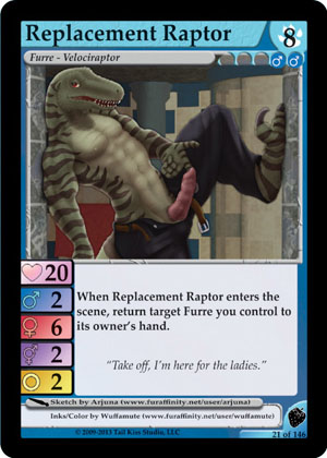 Skills: When Replacement Raptor enters the scene, return target Furre you control to its owner's hand. Flavor Text: "Take off, I'm here for the ladies." Artist: Arjuna Artist: Wuffamute Edition: 3rd Vanilla: Strawberry Rarity: Starter-Only Collector's Number: 21 / 146 |