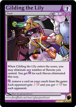 Gender: Herm AP Cost: 1 GP Cost: ![]() ![]() Type: Treat Skills: When Gilding the Lily enters the scene, you may eliminate any number of Havens you control. You get ![]() ![]() ![]() ![]() Flavor Text: [None] Artist: glassjawboxer Edition: 3rd Vanilla: Strawberry Rarity: Rare Collector's Number: 68 / 146 |