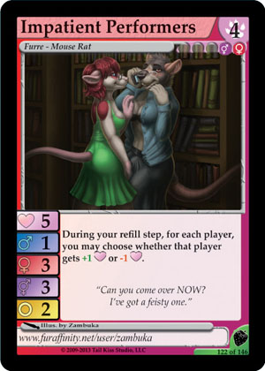 Skills: During your refill step, for each player, you may choose whether that player gets +1 Flavor Text: "Can you come over NOW? I've got a feisty one." Artist: Zambuka Edition: 3rd Vanilla: Strawberry Rarity: Uncommon Collector's Number: 122 / 146 | |||||||||||