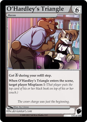 Gender: Haven AP Cost: 6 GP Cost: Type: Haven Skills: Get When O'Hardley's Triangle enters the scene, target player Misplaces 1 (That player puts the top card of his or her black book on top of his or her couch.) Flavor Text: The cover charge was just the beginning. Artist: Linno Edition: 3rd Vanilla: Strawberry Rarity: Common Collector's Number: 134 / 146 | |
