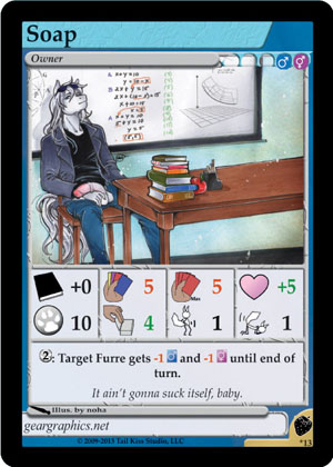 Gender: Male AP Cost: 0 Available Genders: ![]() ![]() Type: Owner Skills: +0 // 5 // 5 // +5 10 // 4 // 1 // 1 ![]() ![]() ![]() Flavor Text: It ain't gonna suck itself, baby. Artist: noha Edition: Owner Cards Rarity: Rare Collector's Number: 13 / * |