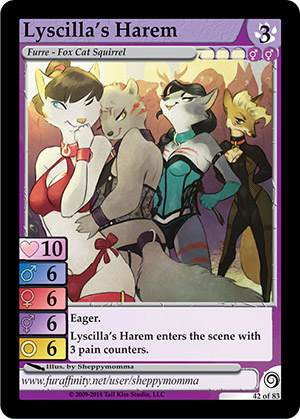 Skills: Eager. Lyscilla's Harem enters the scene with 3 pain counters. Flavor Text: [None] Artist: Sheppymomma Edition: Di'Ahla's Awakening Rarity: Common Collector's Number: 42 / 83 | |||||||||||