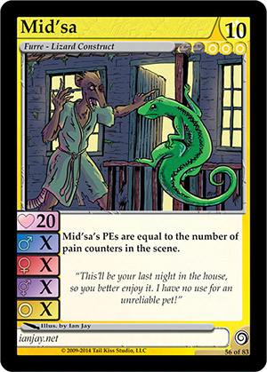 Skills: Mid'sa's PEs are equal to the number of pain counters in the scene. Flavor Text: "This'll be your last night in the house, so you better enjoy it. I have no use for an unreliable pet!" Artist: Ian Jay Edition: Di'Ahla's Awakening Rarity: Rare Collector's Number: 56 / 83 | |||||||||||