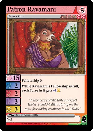 Skills: Fellowship 3. While Ravamani's Fellowship is full, each Furre in it gets +4 Flavor Text: "I have very specific tastes; I expect Hibiscus and Madita to bring me the most fascinating creatures in the Wilds." Artist: ArsenicKitty Edition: Fortune at Vell's End Rarity: Uncommon Collector's Number: 52 / 162 | |||||||||||