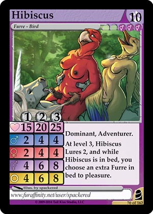 Skills: Lv0: 15 Lv2: 20 Lv3: 25 Dominant, Adventurer. At level 3, Hibiscus Lures 2, and while Hibiscus is in bed, you choose an extra Furre in bed to pleasure. Flavor Text: [None] Artist: spackered Edition: Fortune at Vell's End Rarity: Rare Collector's Number: 70 / 162 | |||||||||||
