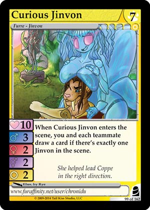 Skills: When Curious Jinvon enters the scene, you and each teammate draw a card if there's exactly one Jinvon in the scene. Flavor Text: She helped lead Coppe in the right direction. Artist: Rye Edition: Fortune at Vell's End Rarity: Common Collector's Number: 99 / 162 | |||||||||||