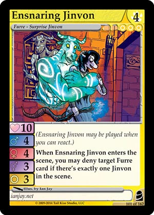 Skills: (Ensnaring Jinvon may be played when you can react.) When Ensnaring Jinvon enters the scene, you may deny target Furre card if there's exactly one Jinvon in the scene. Flavor Text: [None] Artist: Ian Jay Edition: Fortune at Vell's End Rarity: Rare Collector's Number: 101 / 162 | |||||||||||