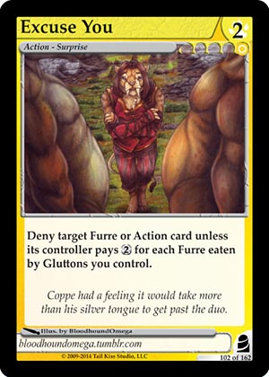 Gender: Otherkind AP Cost: 2 GP Cost: ![]() Type: Action - Surprise Skills: Deny target Furre or Action card unless its controller pays Flavor Text: Coppe had a feeling it would take more than his silver tongue to get past the duo. Artist: BloodhoundOmega Edition: Fortune at Vell's End Rarity: Common Collector's Number: 102 / 162 | |
