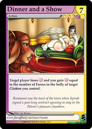 Gender: Herm / Otherkind AP Cost: 7 GP Cost: ![]() ![]() Type: Action Skills: Target player loses Flavor Text: Ravamani was the toast of the town when Syrrah signed a year-long contract agreeing to stay in the Patron's pleasure chambers. Artist: Roum Edition: Fortune at Vell's End Rarity: Uncommon Collector's Number: 129 / 162 | |
