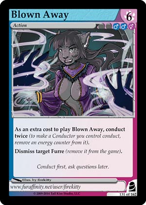 Gender: Male / Herm AP Cost: 6 GP Cost: ![]() ![]() ![]() Type: Action Skills: As an extra cost to play Blown Away, conduct twice (to make a Conductor you control conduct, remove an energy counter from it). Dismiss target Furre (remove it from the game). Flavor Text: Conduct first, ask questions later. Artist: firekitty Edition: Fortune at Vell's End Rarity: Common Collector's Number: 131 / 162 | |