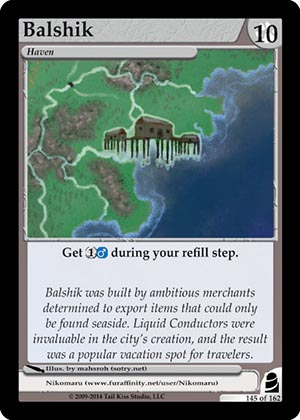 Gender: Haven AP Cost: 10 GP Cost: Type: Haven Skills: Get Flavor Text: Balshik was built by ambitious merchants determined to export items that could only be found seaside. Liquid Conductors were invaluable in the city's creation, and the result was a popular vacation spot for travelers. Artist: mahsroh Artist: Nikomaru Edition: Fortune at Vell's End Rarity: Common Collector's Number: 145 / 162 | |