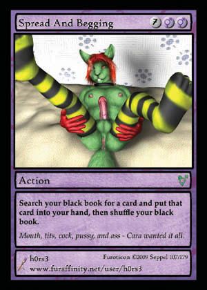 Gender: Herm AP Cost: 7 GP Cost: ![]() ![]() Type: Action Skills: Search your black book for a card and put that card into your hand, then shuffle your black book. Flavor Text: Mouth, tits, cock, pussy, and ass - Cara wanted it all. Artist: h0rs3 Edition: 1st Vanilla Rarity: Uncommon Collector's Number: 107 / 179 | |