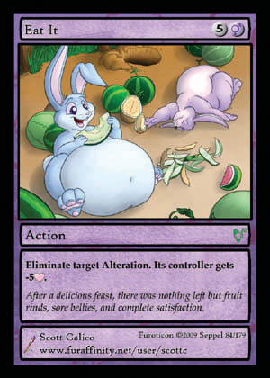 Gender: Herm AP Cost: 5 GP Cost: ![]() Type: Action Skills: Eliminate target Alteration. Its controller gets -5 Flavor Text: After a delicious feast, there was nothing left but fruit rinds, sore bellies, and complete satisfaction. Artist: Scott Calico Edition: 1st Vanilla Rarity: Starter-Only Collector's Number: 84 / 179 | |