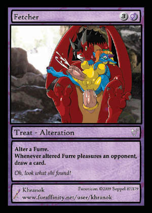 Gender: Herm AP Cost: 3 GP Cost: ![]() Type: Treat - Alteration Skills: Alter a Furre. When altered Furre pleasures an opponent, draw a card. Flavor Text: Oh, look what shi found! Artist: Khranok Edition: 1st Vanilla Rarity: Common Collector's Number: 87 / 179 | |